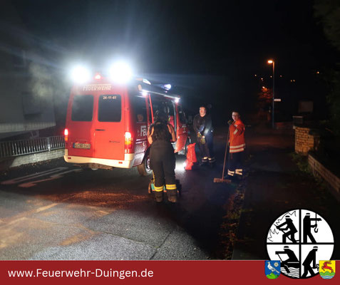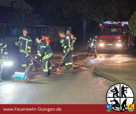 Wir streuten die Ölflecken ab, nahmen das Bindemittel auf und bestreuten den dünnen Ölfilm ebenfalls mit geringen Mengen Bindemittel. Nach ca. 2.5 Stunden konnten wir wieder einrücken.