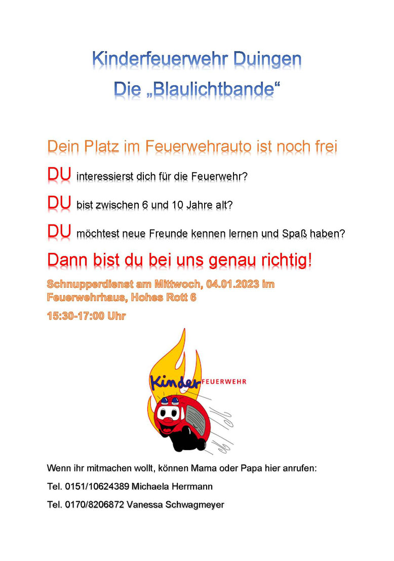 Der erste Schnupperdienst findet am Mittwoch, 04. Januar 2023, zwischen 15:30 Uhr und 17:00 Uhr im Feuerwehrhaus Hohes Rott 6 in 31089 Duingen statt.